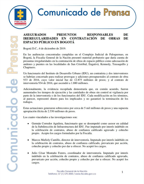 En el contexto de las audiencias concentradas en el Complejo Judicial de Paloquemao en Bogotá, el ente acusatorio habría presentado material probatorio que involucraría a Germán Corredor, funcionario del IDU, a Tomás Pachón, contratista de obra y a Marcos Mafioly y Julio César Montaño, dos interventores; quienes serían los primeros afectados por la investigación que revisó los contratos de adecuación de puentes y andenes en las localidades de San Cristóbal, Engativá. Kennedy, Teusaquillo y Chapinero en 2016.
