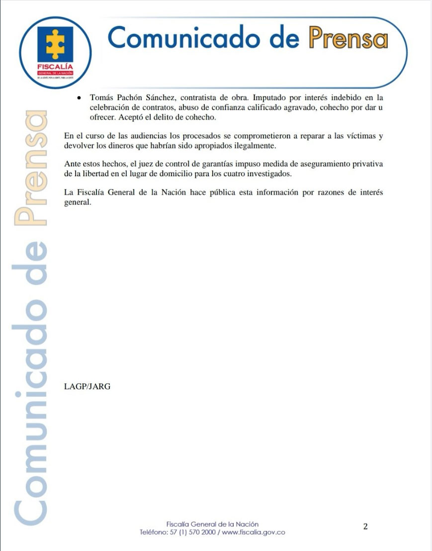 Cabe recordar, que dichos funcionarios habrían recibido presuntamente dineros por estas irregularidades, que a fin de términos nunca tuvieron un cierre de trabajos, por lo que el juez de control de garantías impuso medida de “casa por cárcel”; no obstante, los procesados aseguraron que iban a indemnizar a las víctimas de sus actos, donde devolverían los dineros de los que se apropiaron de manera ilegal.