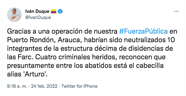 El presidente Iván Duque, anunció este jueves que tras una operación de la Fuerza Pública en Puerto Rondón, Arauca, habrían sido neutralizados 10 integrantes de la estructura décima de disidencias de las Farc.