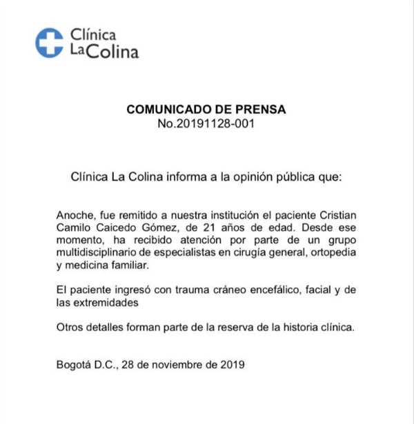 La Clínica Colina en su primer parte médico, informó que Caicedo Gómez llegó en las horas de la noche y desde ahí ha recibido atención médica, ahora está a la espera de ser evaluado por parte de especialistas en cirugía general, ortopedia y medicina familiar, igualmente, el centro médico señaló que el paciente presentó un trauma encefálico, facial y de extremidades.