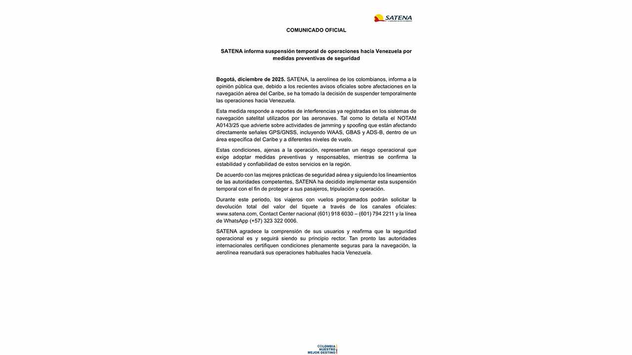 La aerolínea estatal Satena anunció la suspensión temporal de sus vuelos desde y hacia la ciudad venezolana de Valencia debido a “intermitencias” en los sistemas de navegación satelital utilizados por sus aeronaves, en medio de la tensión generada tras el anuncio del presidente de EEUU Donald Trump, sobre el cierre del espacio aéreo venezolano.